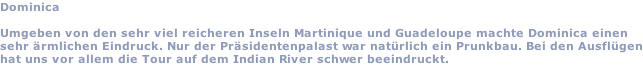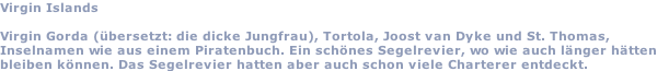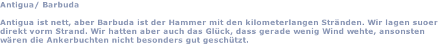 One life, live it Klick auf das Bild zum Vergrößern! Lles des Saintes/ Guadeloupe  Die Schmetterlingsinsel mit ihrer kleinen netten Schwester. St. Kitts & Nevis  Sie gelten wegen ihrer Natur und dem moderaten Tourismus als „andere“ Karibikinseln. Leider konnten wir davon nicht allzuviel entdecken, weil derAnkerplatz viel zu unruhig war. St. Barth/ St. Martin/ Sint Maarten/ Anguilla  Touristisch voll erschlossen und zum Teil sehr mondän. Nur Anguilla machte einen nicht so wohlhabenden Eindruck. Da fehlte das Geld eines europäischen Mutterlandes. Puerto Rico  Wir waren sehr beeindruckt von San Juan. Seit langem mal wieder eine Großstadt und dann mit so einem Flair. Der Abschied fiel uns richtig schwer. Turks and Caicos  Der Segeltörn -60 SM- über die bank bei 2-5 Metern Wassertiefe war unglaublich schön. Klares Wasser und Sandboden. Ansonsten sind die schönen Ecken an Resortbetreiber verkauft. Worden. Bahamas - Mayaguana  Unsere erste Bahamasinsel, und so toll. Wir lagen mit 6 Booten in einer sehr grossen  geschützten Bucht mit glasklarem Wasser. Ansonsten ist die Insel mit 300 Einwohnern ein kleiner Fleck im grossen Atlantik. Bahamas - Exumas  So haben wir uns das vorgestellt: angenehmes Segeln, tolles Wasser, immer einen geschützten Ankerplatz und dazu schwimmende Schweine, bunte Fische und hoffentlich harmlose Haie. Dominica - Bahamas